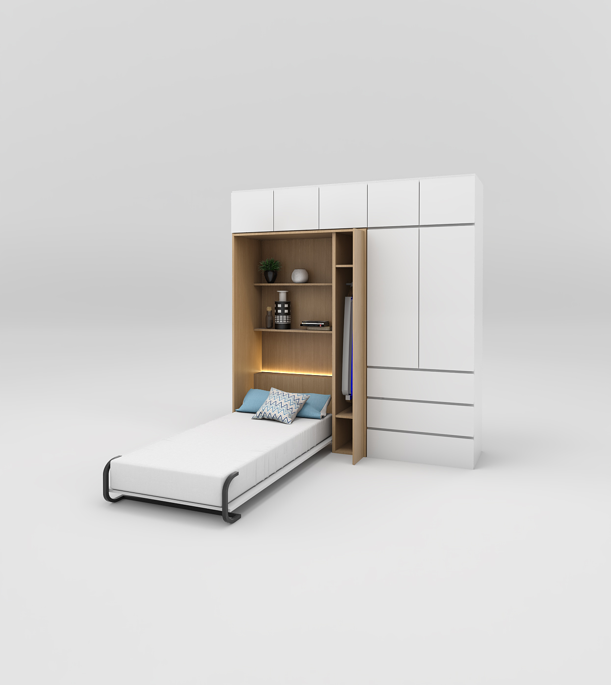 A: Our murphy bed features a reliable hydraulic lift mechanism that ensures smooth operation. The hydraulic lift system, consisting of pistons/pumps installed on both sides of the bed cabinet, effectively balances the weight of the mattress, making it safe and easy to bring the bed down. The entire hardware set, including the metal frame, is manufactured in China.